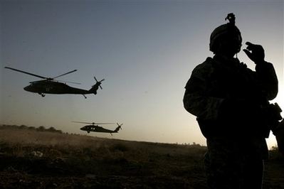 A US soldier stands guard as two US military helicopters are seen following the second roadside bomb explosion of the day during the Sukhumi clearing operation in the area of Al-leg, some 60 kilometers (40 miles) south of Baghdad, Iraq, Friday, March 7, 2008. [Agencies]