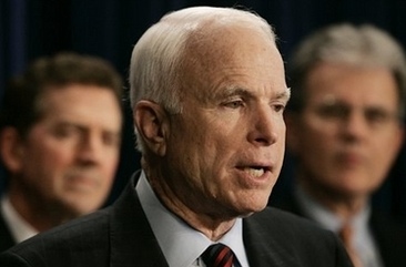 Republican presidential candidate, Sen. John McCain, R-Ariz., speaks during a news conference, Thursday, March 13, 2008, on Capitol Hill in Washington. Joining him at left is Sen. Jim DeMint, R-S.C., and at right is Sen. Tom Coburn, R-Okla. [Agencies]