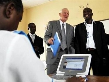 Craig Barrett (C), chairman of Intel, looks on as a student of Gwarinpa secondary school uses a laptop computer in Abuja, Nigeria, October 31, 2007. [Agencies]