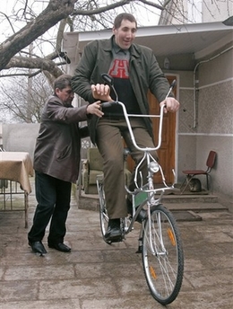 Ukrainian veterinarian, Leonid Stadnik, 2.59 meter (8,5 feet) tall, the world's tallest living man according to the Guinness Book of Records, rides a bicycle specially made for him, in the village of Podoliantsy, Ukraine's northwestern Zhytomyr region, 212 kilometers (131.74 miles) west of the capital Kiev, Sunday, March 23, 2008. [Agencies]