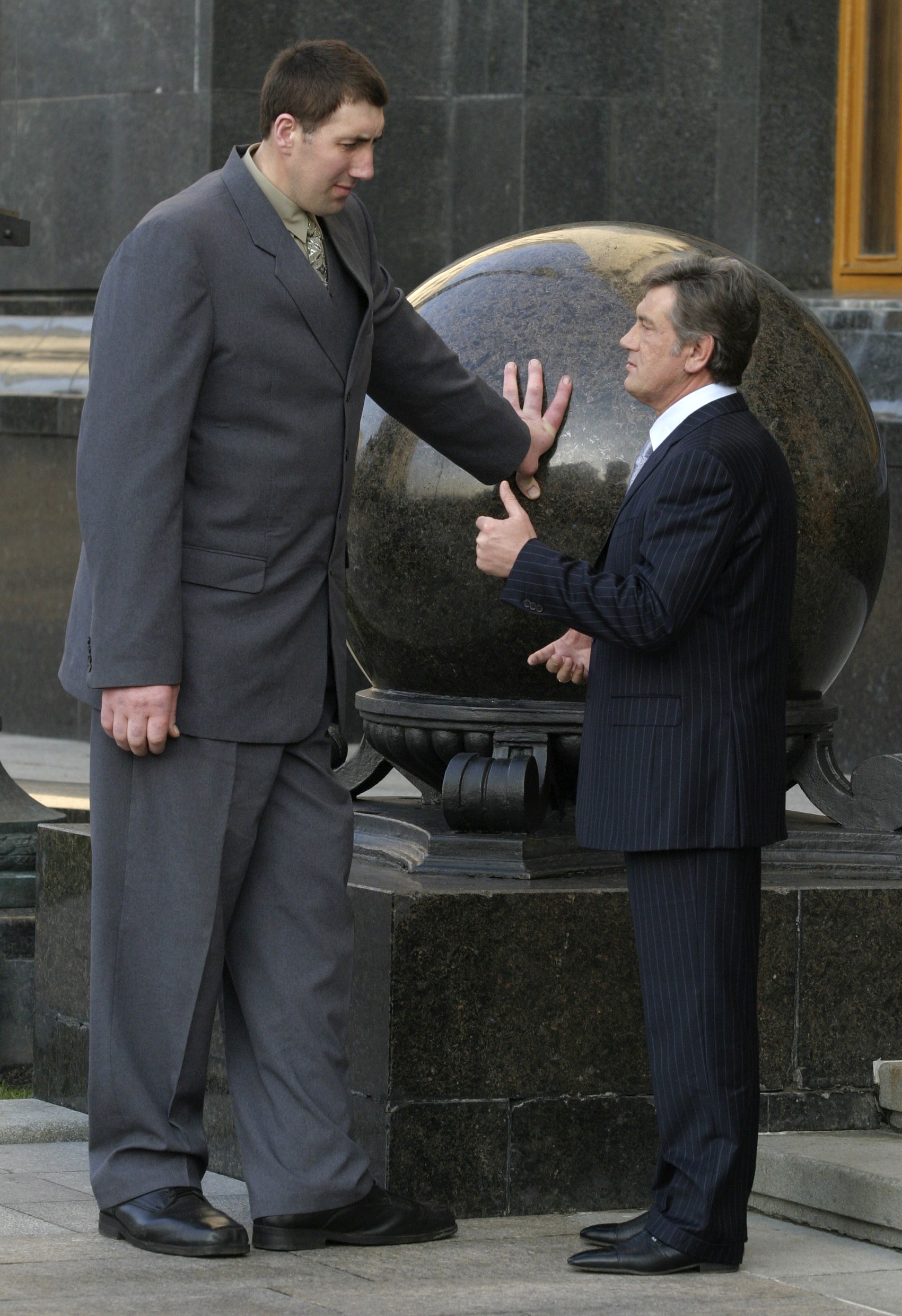 | Leonid Stadnyk (L) of Ukraine, named as the world's tallest man by the Guinness World Records, stands next to Ukraine's President Viktor Yushchenko as they talk in Kiev March 24, 2008. Stadnyk, who stands at 2.53 metres (8 feet, four inches), received a car as a present from the president. [Agencies] |