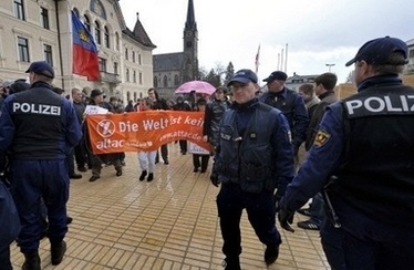 Members of the anti-globalisation organisation ATTAC march on March 1, under the eyes of the police during a protest staged against tax haven in the Liechtenstein capital Vaduz. [Agencies]
