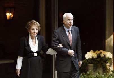 US Republican presidential candidate Senator John McCain (R-AZ) walks with former first lady Nancy Reagan at her residence in Bel Air, California March 25, 2008. Nancy Reagan endorsed Arizona Senator John McCain for the presidency. [Agencies]