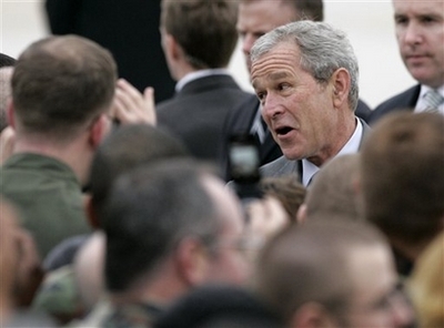 President Bush greets Air Force airmen at McGuire Air Force in New Jersey Friday, March 28, 2008. Bush was leaving after visiting Novadebt Consumer Credit Counseling service in Freehold, N.J. [Agencies]