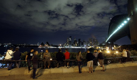 Sightseers gather to look at Sydney's central business district after many lights were turned off during earth hour on March 29, 2008. Thousands of lights that illuminate office buildings, public structures and monuments were switched off Saturday darkening the city's iconic skyline for one hour, in an effort to publicise the effects of climate change. [Agencies]