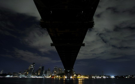 The Sydney Harbour Bridge, which leads to the city's central business district, stands black with its lights turned off during earth hour on March 29, 2008. Thousands of lights that illuminate office buildings, public structures and monuments were switched off Saturday darkening the city's iconic skyline for one hour, in an effort to publicise the effects of climate change. [Agencies]