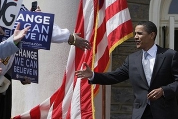 US Democratic presidential hopeful Barack Obama reaches to shake hands before he speaks at Penn State University in University Park , Pa., Sunday, March 30, 2008. [Agencies]