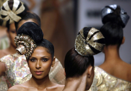 Models present creations by Indian designer Priya Kataria Puri during the second day of India Fashion Week in Mumbai March 30, 2008. [Agencies]