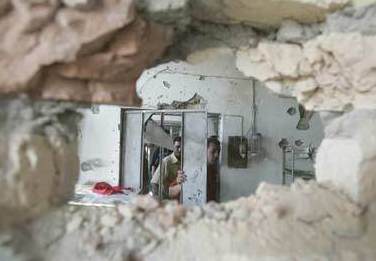 Residents stand at the door of their damaged house after clashes in Baghdad's Sadr City March 29, 2008. [Agencies]