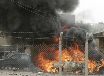 Vehicles burn after a US air strike in a parking lot in Baghdad's Sadr City March 28, 2008. [Agencies]