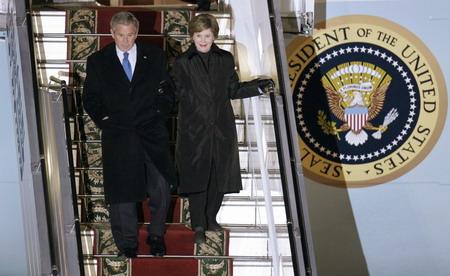 US President George W. Bush and first lady Laura Bush arrive at Borispol airport outside Kiev, March 31, 2008. He is to start his two-day state visit to Ukraine. [Agencies]