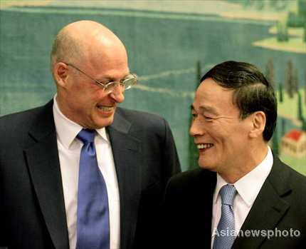 Chinese President Hu Jintao's special representative and Vice Premier Wang Qishan (R) meets with Henry M. Paulson (L), special representative of US President George W. Bush and the US Treasury Secretary, in Beijing, April 2, 2008. Paulson arrived in Beijing on Wednesday to start his two-day China trip for preparations for the fourth round of China-US Strategic Economic Dialogue (SED). [Asianewsphoto]