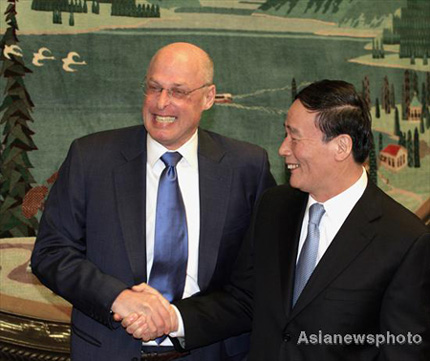 Chinese President Hu Jintao's special representative and Vice Premier Wang Qishan (R) meets with Henry M. Paulson (L), special representative of US President George W. Bush and the US Treasury Secretary, in Beijing, April 2, 2008. Paulson arrived in Beijing on Wednesday to start his two-day China trip for preparations for the fourth round of China-US Strategic Economic Dialogue (SED). [Asianewsphoto]