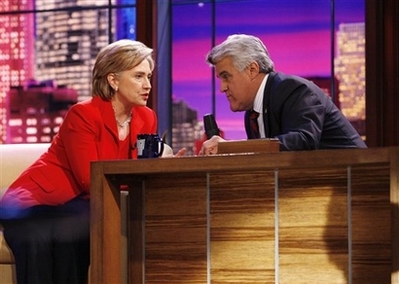 Updated: 2008-04-04 20:10 BURBANK - Hillary Rodham Clinton made fun of herself Thursday, telling "Tonight Show" host Jay Leno she almost didn't make it to his studio. "It is so great to be here, I was so worried I wasn't going to make it. I was pinned down by sniper fire," Clinton said after joining him onstage, referring to her claims - since disputed - that she dodged sniper bullets while arriving in Bosnia as first lady. Clinton later said she had "misspoke." As she entered, Leno's band played the "Rocky" theme, jumping off her statement this week that she is the underdog in the Democratic nominating contest against Barack Obama, just like the fictitious boxer was against his opponent in the Oscar-winning movie. Leno asked how much sleep Clinton was getting. "Answering the phone at 3:00, that's gotta be tough," he joked, referring to her campaign commercials that ask which candidate would be the best prepared as president for middle-of-the-night emergencies. "It happens every single night. Someone calls up and they have something to say. You've got to stop calling me," Clinton told Leno. Clinton said she was proud of her daughter, Chelsea, 28, who has been campaigning for her. But she said her "stomach is in knots" most days thinking about what she might encounter each day. Chelsea Clinton has fielded some tough questions in recent appearances, particularly about her father's relationship with White House intern Monica Lewinsky. Her response has been that it's none of the questioner's business. Asked about her daughter telling a voter that her mother might make a better president than her father, Bill Clinton, Hillary Clinton grinned and said: "She is such a smart young woman." Leno also asked about moments during the campaign in which the former president has blown up at reporters and others. "When you're supporting someone you love, you really do take it very much to heart," she said. "I said 'OK, honey, that's all right, we don't have to go get excited about it.' He's doing a great job for me but he does get a little carried away sometimes." |