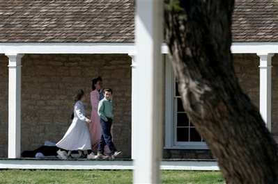 Members of the Fundamentalist Church of Jesus Christ of Latter-Day Saints walk along the grounds of their temporary housing at the Fort Concho National Historic Landmark, in San Angelo, Texas, Monday, April 7, 2008. More than 400 children were taken into state custody from a polygamist sect in what authorities described Monday as the largest child-welfare operation in Texas history. [Agencies]