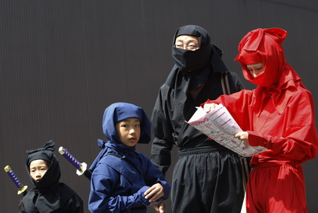 Family dressed as ninjas look at a map as they search for hidden ninja mannequins during a ninja festival in Iga, about 450 km (280 miles) from Tokyo, April 6, 2008. The quiet city of 100,000 attracts almost 30,000 visitors for its annual ninja festival, which runs from April 1 to May 6 and features ninja-inspired dance performances, competitions, and opportunities to practise ninja skills. [Agencies]