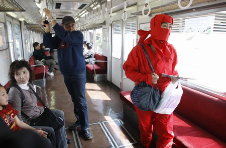 A woman dressed as a ninja rides a train during a ninja festival in Iga, about 450 km (280 miles) from Tokyo, April 5, 2008. The quiet city of 100,000 attracts almost 30,000 visitors for its annual ninja festival, which runs from April 1 to May 6 and features ninja-inspired dance performances, competitions, and opportunities to practise ninja skills. [Agencies]