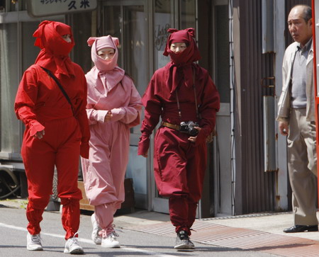 A man looks at women dressed as ninjas during a ninja festival in Iga, about 450 km (280 miles) from Tokyo, April 6, 2008. The quiet city of 100,000 attracts almost 30,000 visitors for its annual ninja festival, which runs from April 1 to May 6 and features ninja-inspired dance performances, competitions, and opportunities to practise ninja skills. [Agencies]