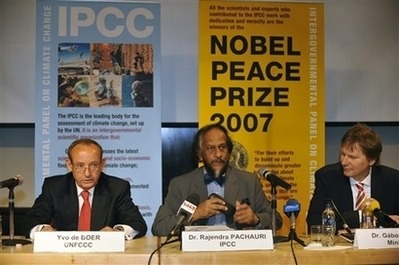 From left, Secretary General of the United Nations Framework Convention on Climate Change, UNFCCC, Yvo de Boer, Chairman of the Nobel Peace Prize 2007 winning Intergovernmental Panel on Climate Change, IPCC, Rajendra Pachauri of India and Hungarian Minister of Environment and Water Management Gabor Fodor hold a press conference before the opening session of the 28th conference of IPCC in the Budapest Convention Centre in Budapest, Hungary, Wednesday, April 9, 2008. [Agencies]