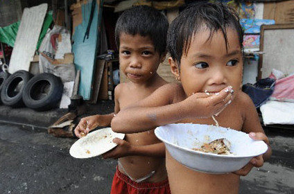 Filipino children living in a slum area Jordan Buhawi, 5, (L) and his sister Sunshine, 4, (R) eat a meal of rice mixed with noodles and dried fish in Manila in this undated photo. [Agencies]