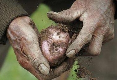 A farmer clears soil off a native potato on his plot in Chincheros in the Andean highlands of Cuzco in this March 25, 2008 file photo. [Agencies]