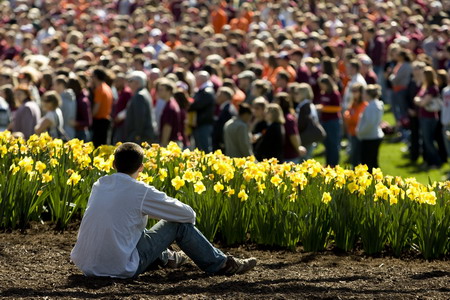 Virginia Tech student Jay Osborne sits overlooking the crowd during a memorial service for the victims of the April 16, 2007 shootings on the campus of Virginia Tech in Blacksburg, Virginia April 16, 2008. [Agencies]
