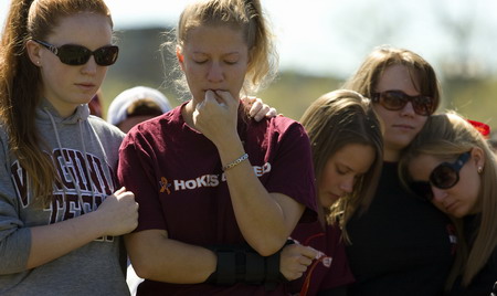Virginia Tech students Jerilyn Brooks (L) and Elizabeth Gillespie (C) reflect during a memorial service for the victims of the April 16, 2007 shootings on the campus of Virginia Tech in Blacksburg, Virginia April 16, 2008. [Agencies]