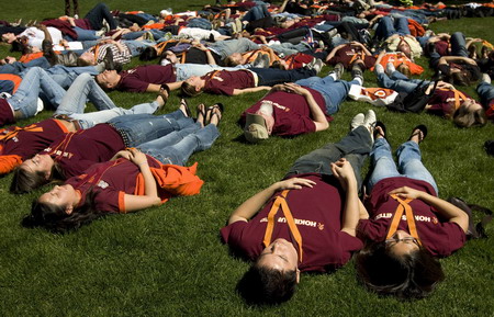 Virginia Tech students take part in an anti-gun lie-in protest on the campus of Virginia Tech in Blacksburg April 16, 2008. A memorial service was held for the victims of the April 16, 2007 shootings on the campus. [Agencies]