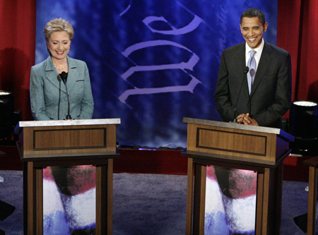US Democratic presidential candidates Senator Hillary Clinton (D-NY) and Senator Barack Obama (D-IL) stand at their podiums before the Democratic Presidential Debate at the National Constitution Center in Philadelphia April 16, 2008. [Agencies]