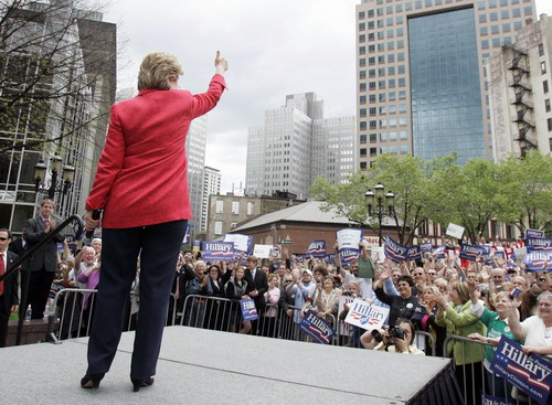 US Senator Hillary Clinton (D-NY) gives the thumbs up to a crowd of supporters in Market Square in downtown Pittsburgh, Pennsylvania on April 21, 2008. [Agencies]