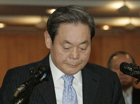Samsung Group Chairman Lee Kun-hee reacts during a news conference at the company's headquarters in Seoul April 22, 2008. [Agencies]