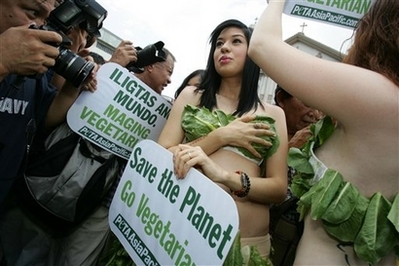 PETA (People for the Ethical Treatment of Animals) activists American national Istara Bon Gundry, center, and Canadian Ashley Fruno. right, clad partly with fresh lettuce, hold placards as they protest at a square outside a Catholic church in Manila's Quiapo district Friday April 18, 2008, in the Philippines. The activists, protesting ahead of the global celebration of Earth Day next week, alleged in their statement that 'meat production has a devastating impact on the environment' and urged people to go vegetarian instead. [Agencies]