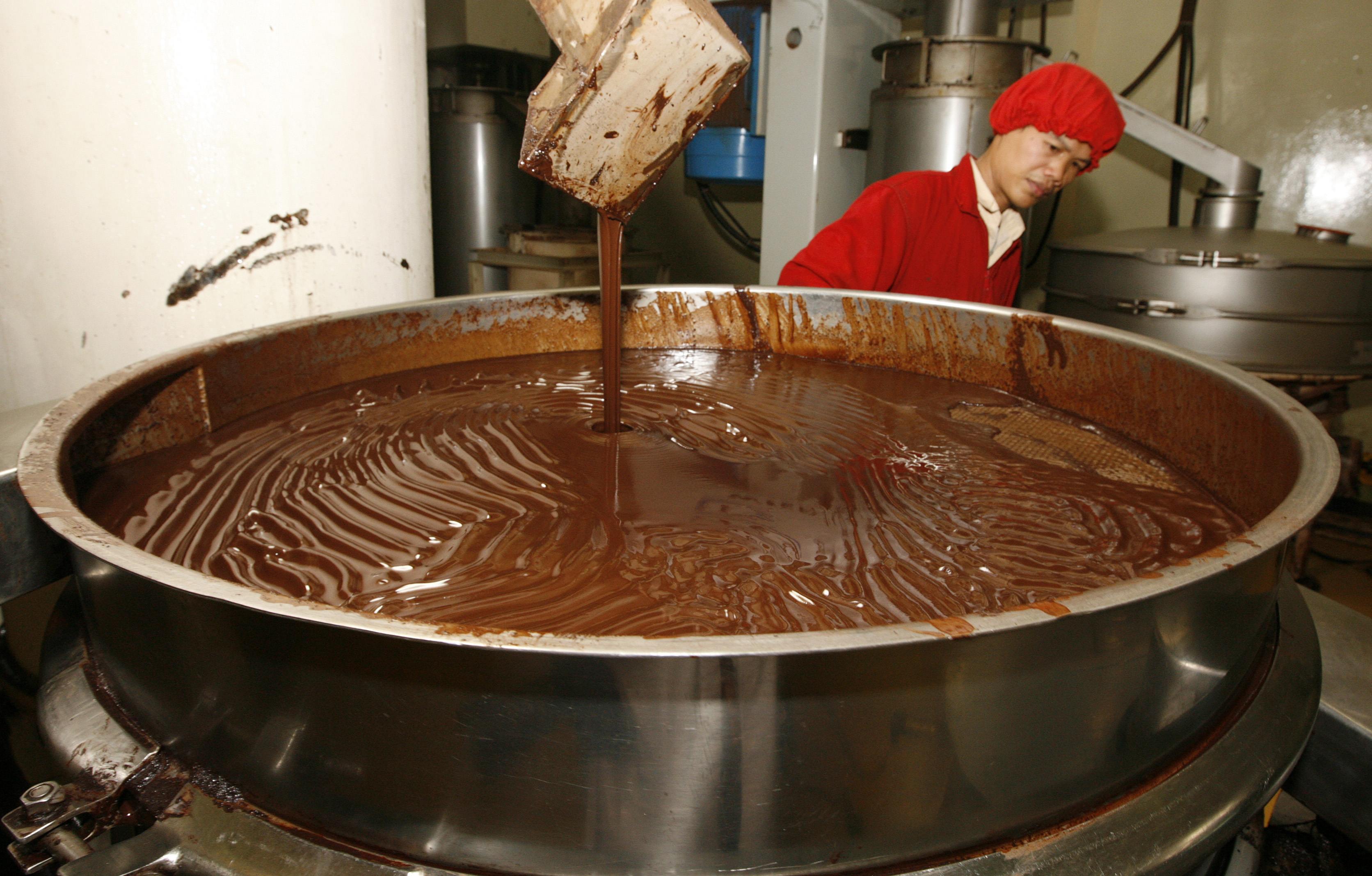 | A worker monitors liquid chocolate at PT Bumitangerang Mesindotama, West Java April 18, 2008. Indulging in chocolate during pregnancy could help ward off a serious complication known as preeclampsia, new research suggests. [Agencies] |