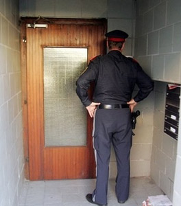 A police officer stands inside the entrance of the house in Amstetten, Austria, April 28, 2008, where Josef Fritzl has confessed to imprisoning his own daughter for 24 years in a cellar and fathering seven children with her. [Agencies]