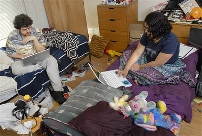 Roommates Erik Youngdahl, left, and Michelle Garcia surf the internet in their room in a house for students with an interest in Russian studies at Wesleyan University in Middletown, Conn., Thursday, April 24, 2008. Garcia and Youngdahl share a room because they realized they made the best fit compared to their other roommate options. At least two dozen schools now have policies that allow some or all students to share a room with whomever they choose. [Agencies]