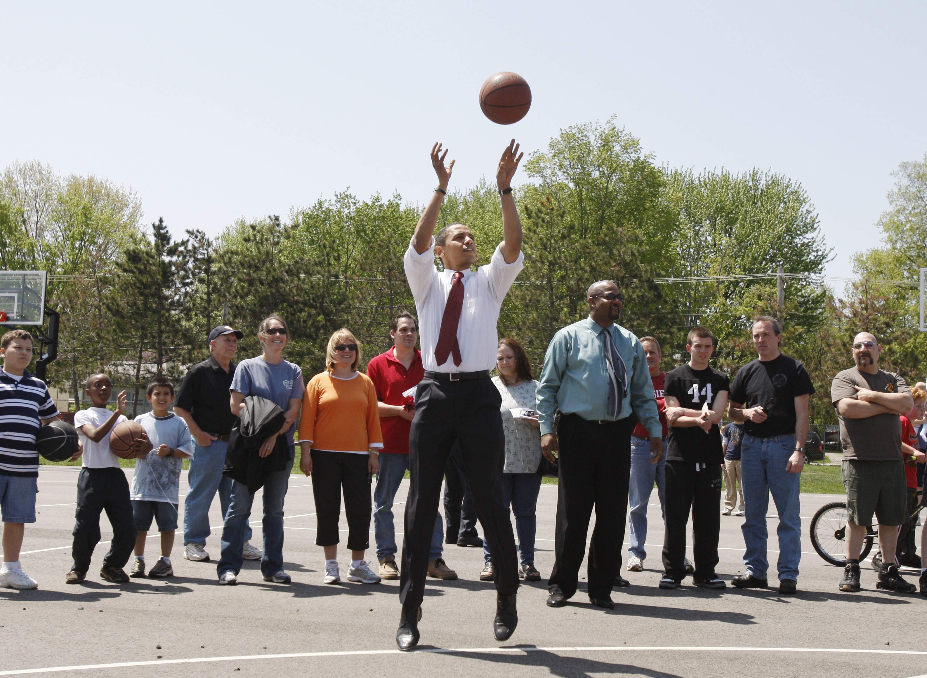 | U.S. Democratic presidential candidate Senator Barack Obama (D-IL) plays basketball during an impromptu stop at Riverview Elementary School in Elkhart, Indiana, May 4, 2008. The Indiana Presidential Primary will be held on May 6. [Agencies] |