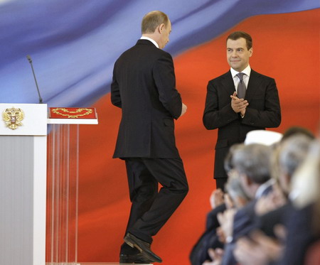 Russia's President Vladimir Putin (L) and Dmitry Medvedev (R) take part in an inauguration ceremony in Moscow's Kremlin throne room May 7, 2008. Medvedev was sworn in as Russian president on Wednesday and just over two hours later nominated his predecessor Putin as prime minister, ushering in an unprecedented period of dual rule. [Agencies]