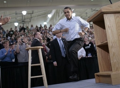 Democratic presidential hopeful, Sen. Barack Obama, D-Ill., arrives at a town hall-style meeting in Bend, Ore., Saturday, May 10, 2008. [Agencies]