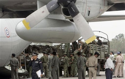 Myanmar soldiers unload bags of supplies aid, donated by Thai King Bhumibol Adulyadej, from a Thai military plane onto a truck at Yangon airport in Myanmar Sunday, May 11, 2008. More food reached Myanmar's hungry cyclone victims as roads were cleared of fallen trees. [Agencies]