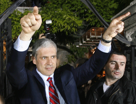 Serbian President and leader of the Democratic Party Boris Tadic greets supporters in front of the party's headquarters while celebrating victory in parliamentary elections in Belgrade May 11, 2008. [Agencies]