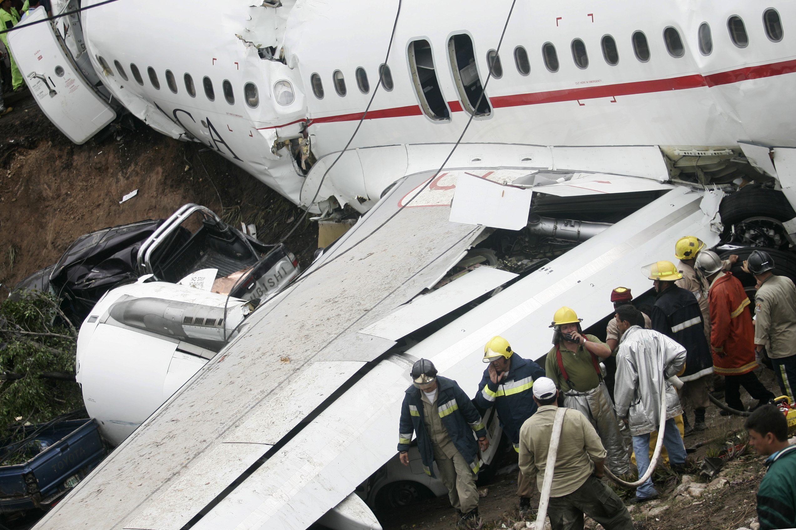 | Rescue workers attend the scene where a passenger plane skidded off a runway at Tegucigalpa airport in Honduras, May 30, 2008. The TACA airlines Airbus, which had 135 people on board, skidded on landing veering onto a road and smashing into cars and a building, killing at least five people. [Agencies] |