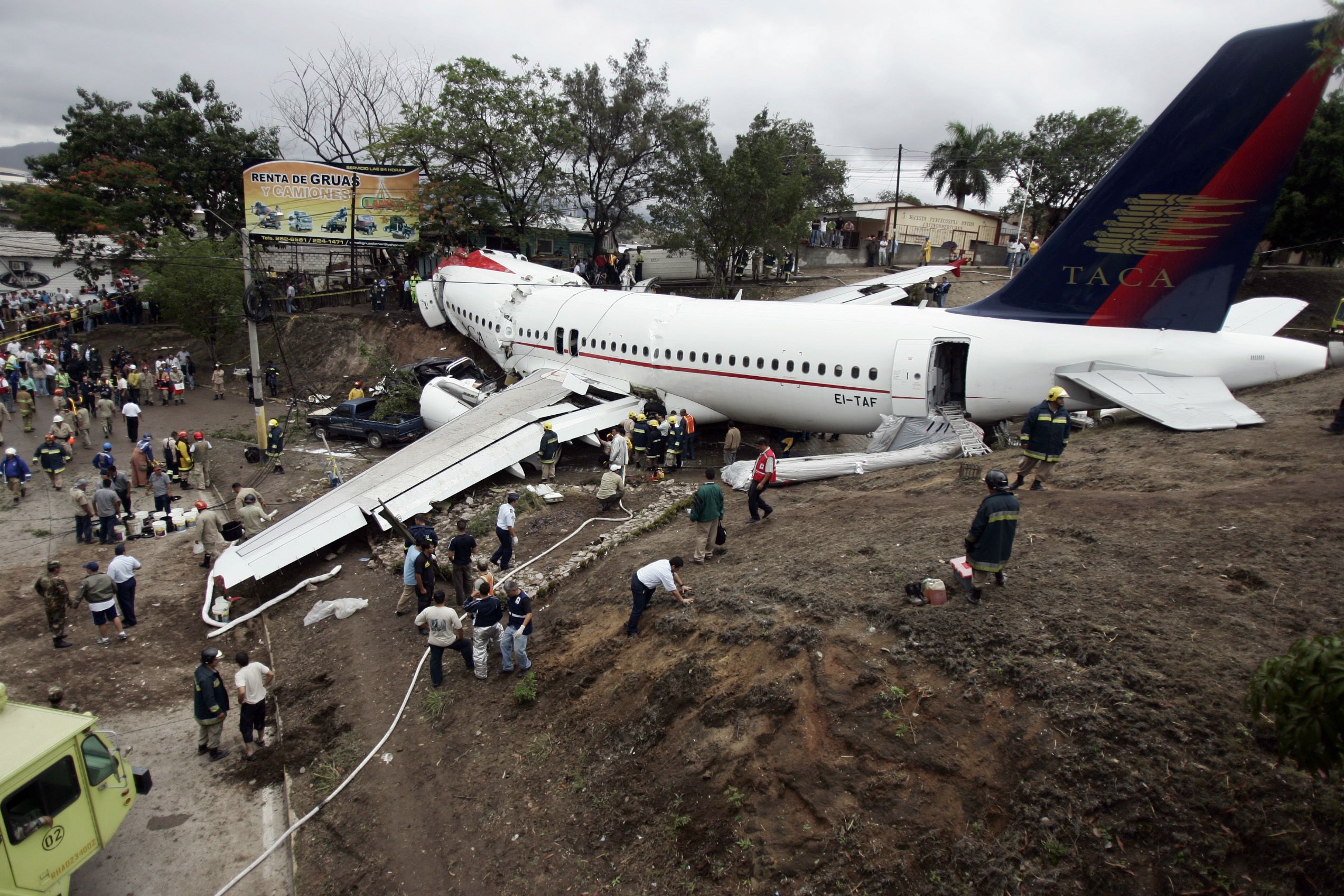 | Rescue workers surround a passenger plane which skidded off a runway at Tegucigalpa airport in Honduras, May 30, 2008. The TACA airlines Airbus, which had 135 people on board, skidded on landing veering onto a road and smashing into cars and a building, killing at least five people. [Agencies] |