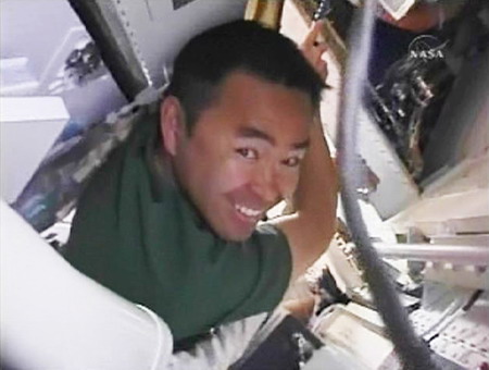 Japan Aerospace Exploration Agency astronaut Akihiko Hoshide smiles as he works on the mid deck of the Space Shuttle Discovery making preparations for docking with the International Space Station in this image from NASA TV June 2, 2008. [Agencies]