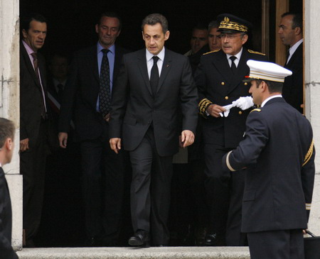 France's President Nicolas Sarkozy (C) walks out of the church after a ceremony for the victims of a coach crash outside the church in Allinges June 3, 2008. Seven children were killed when a train collided with a school bus at a level crossing in eastern France on Monday, French authorities said. [Agencies]