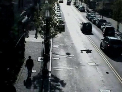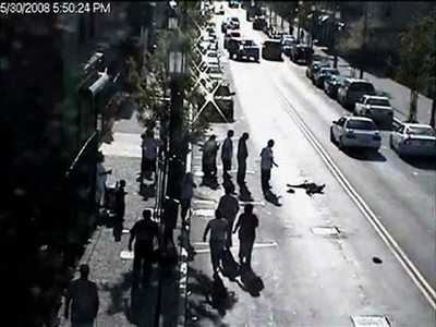 The Hartford Police Department provided this image taken from a surveillance video showing a man, lying in the street, center frame, just after a car hit him, Friday May 30, 2008 in Hartford, Conn. The 78-year-old man was tossed like a rag doll by a hit-and-run driver, and car after car zoomed by as he laid motionless on the busy city street. The victim, Angel Arce Torres, was in critical condition in Hartford Hospital. [Agencies]