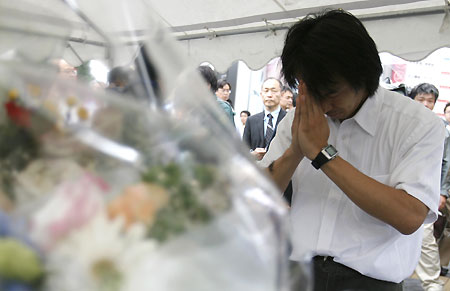 A man offers a prayer in front of flowers dedicated to the victims killed on Sunday in Tokyo's Akihabara district June 9, 2008. [Agencis]