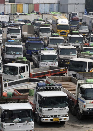 Trucks are parked at the truck terminal in Seoul June 9, 2008. South Korean truckers voted on Monday to strike over high oil prices, piling more pressure on the export-dependent country's new president whose policies have sparked mass street protests. [Agencies]
