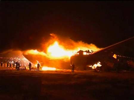 A Sudanese airliner burns at Khartoum airport in this image taken off video footage June 10, 2008. The airliner, which was identified by Sudanese television as an Airbus, was carrying 217 people and had burst into flames after landing at Khartoum airport. [Agencies]
