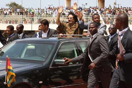 Libyan leader Muammar Ghaddafi (C), accompanied by Togolese President Faure Essozimna Gnassingbe, visits a stadium in Lome, capital of Togo, on June 16, 2008. Muammar Ghaddafi was on a three-day visit to Togo. [Xinhua]