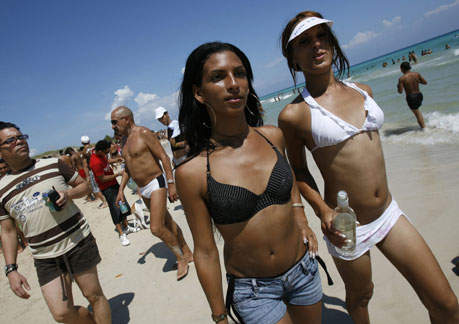 Transvestites walk on the beach during the opening of the gay and lesbian community's summer on the outskirts of Havana June 14, 2008. Much has changed in Cuba since the 1960s when homosexuals were sent to work camps, or the 1970s when gay men and women were denied certain jobs as "ideological deviants." [Agencies]